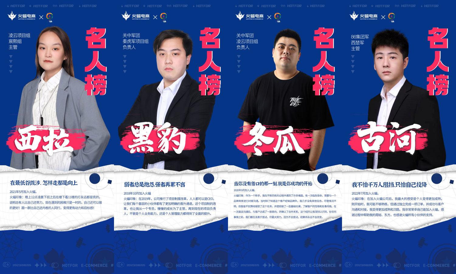 當日下午兩點,慶典正式拉開帷幕。現(xiàn)場布置精美,名人榜、簽到墻清晰地展現(xiàn)了該企業(yè)九年的光輝歷程與成就。走進會場,最引人注目的莫過于巨幅「名人榜」海報。「此時此刻,非我莫屬」「天生我材必有用」「因為相信,所以看見」......上面標注著「人生格言」與「名人事跡」。英姿颯爽的面容、炯炯有神的雙目,通過不懈努力,從普通員工一路成長為項目負責人/主管,他們是來自于設計、銷售、運營等各版塊的杰出代表,也是火蝠電商發(fā)展的中流砥柱。值得注意的是,不少女員工也赫然位列「名人榜」上,摒棄性別偏見,以成績論英雄,在這個大舞臺上,任何人都施展拳腳的機會。這也表明公司CEO鐘雨清先生對人才的高度重視,注重人才的均衡培養(yǎng),并將其擺在企業(yè)發(fā)展的核心位置。